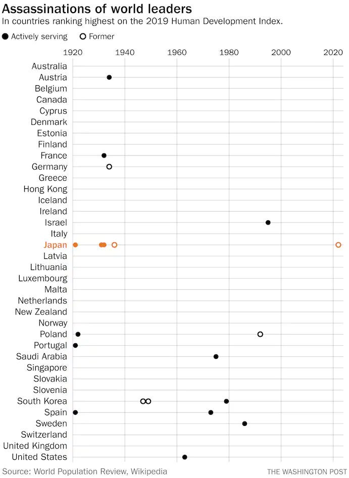 That chart should raise the question of why assassination is relatively rare. Think about all the political rancor. Just look at America alone. When I was a kid, I remember being told Bill Clinton was going to put people into FEMA concentration camps. When I was a little older, a lot of people called George W. Bush the new Hitler. When I was a little older than that, a lot of people called Barack Obama a Muslim Hitler. When I was even older, a lot of people called Donald Trump a new Hitler. And yet, two things are true. One, people desperately need a new reference other than Hitler.3 And two, there were never serious assassination attempts on any of these people. Why?